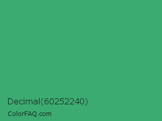 Decimal 60252240 Color is a normal green color and the nearest color is Ocean Green #41aa78. Hex code #3cab72 and RGB value is rgb(60,171,114). In RGB color space, this color is composed of 24% red, 67% green, 45% blue, In CMYK color space, this color is composed of 65% cyan, 0% magenta, 33% yellow , 33% black , In HSL color space, this color has a hue angle of 149° , 48% saturation and 45% lightness.
