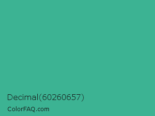 Decimal 60260657 Color is a normal cyan color and the nearest color is Mint #3eb489. Hex code #3cb393 and RGB value is rgb(60,179,147). In RGB color space, this color is composed of 24% red, 70% green, 58% blue, In CMYK color space, this color is composed of 66% cyan, 0% magenta, 18% yellow , 30% black , In HSL color space, this color has a hue angle of 164° , 50% saturation and 47% lightness.