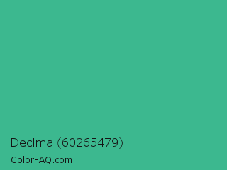Decimal 60265479 Color is a normal green color and the nearest color is Mint #3eb489. Hex code #3cb88f and RGB value is rgb(60,184,143). In RGB color space, this color is composed of 24% red, 72% green, 56% blue, In CMYK color space, this color is composed of 67% cyan, 0% magenta, 22% yellow , 28% black , In HSL color space, this color has a hue angle of 160° , 51% saturation and 48% lightness.