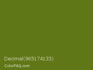 Decimal 965174133 Color is a dark lime color and the nearest color is Fern Frond #657220. Hex code #607717 and RGB value is rgb(96,119,23). In RGB color space, this color is composed of 38% red, 47% green, 9% blue, In CMYK color space, this color is composed of 19% cyan, 0% magenta, 81% yellow , 53% black , In HSL color space, this color has a hue angle of 74° , 68% saturation and 28% lightness.
