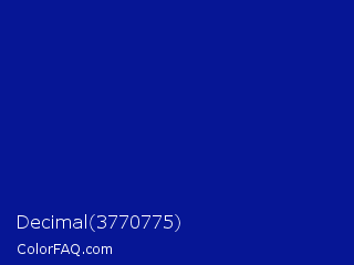 Decimal 3770775 Color is a dark blue color and the nearest color is Indigo Dye #091f92. Hex code #061695 and RGB value is rgb(6,22,149). In RGB color space, this color is composed of 2% red, 9% green, 58% blue, In CMYK color space, this color is composed of 96% cyan, 85% magenta, 0% yellow , 42% black , In HSL color space, this color has a hue angle of 233° , 92% saturation and 30% lightness.