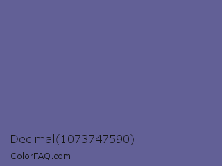 Decimal 1073747590 Color is a normal indigo color and the nearest color is Dark Blue Gray #666699. Hex code #626096 and RGB value is rgb(98,96,150). In RGB color space, this color is composed of 38% red, 38% green, 59% blue, In CMYK color space, this color is composed of 35% cyan, 36% magenta, 0% yellow , 41% black , In HSL color space, this color has a hue angle of 242° , 22% saturation and 48% lightness.