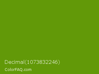 Decimal 1073832246 Color is a normal green color and the nearest color is Limeade #6f9d02. Hex code #629908 and RGB value is rgb(98,153,8). In RGB color space, this color is composed of 38% red, 60% green, 3% blue, In CMYK color space, this color is composed of 36% cyan, 0% magenta, 95% yellow , 40% black , In HSL color space, this color has a hue angle of 83° , 90% saturation and 32% lightness.