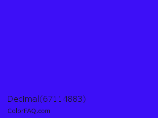 Decimal 67114883 Color is a normal indigo color and the nearest color is Electric Ultramarine #3f00ff. Hex code #3d0ff7 and RGB value is rgb(61,15,247). In RGB color space, this color is composed of 24% red, 6% green, 97% blue, In CMYK color space, this color is composed of 75% cyan, 94% magenta, 0% yellow , 3% black , In HSL color space, this color has a hue angle of 252° , 94% saturation and 51% lightness.