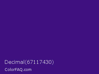 Decimal 67117430 Color is a dark violet color and the nearest color is Pixie Powder #391285. Hex code #3d1180 and RGB value is rgb(61,17,128). In RGB color space, this color is composed of 24% red, 7% green, 50% blue, In CMYK color space, this color is composed of 52% cyan, 87% magenta, 0% yellow , 50% black , In HSL color space, this color has a hue angle of 264° , 77% saturation and 28% lightness.