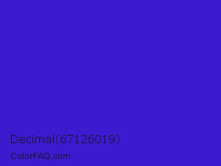 Decimal 67126019 Color is a normal indigo color and the nearest color is Interdimensional Blue #360ccc. Hex code #3d19cf and RGB value is rgb(61,25,207). In RGB color space, this color is composed of 24% red, 10% green, 81% blue, In CMYK color space, this color is composed of 71% cyan, 88% magenta, 0% yellow , 19% black , In HSL color space, this color has a hue angle of 252° , 78% saturation and 45% lightness.