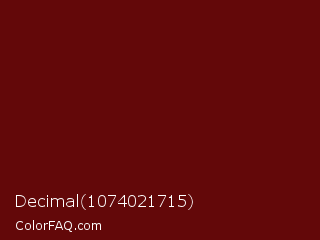 Decimal 1074021715 Color is a very dark red color and the nearest color is Rosewood #65000b. Hex code #630809 and RGB value is rgb(99,8,9). In RGB color space, this color is composed of 39% red, 3% green, 4% blue, In CMYK color space, this color is composed of 0% cyan, 92% magenta, 91% yellow , 61% black , In HSL color space, this color has a hue angle of 359° , 85% saturation and 21% lightness.