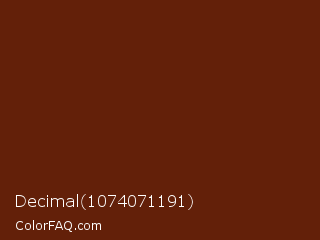Decimal 1074071191 Color is a very dark color and the nearest color is Redwood #5d1e0f. Hex code #632009 and RGB value is rgb(99,32,9). In RGB color space, this color is composed of 39% red, 13% green, 4% blue, In CMYK color space, this color is composed of 0% cyan, 68% magenta, 91% yellow , 61% black , In HSL color space, this color has a hue angle of 15° , 83% saturation and 21% lightness.