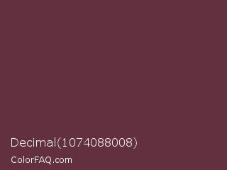 Decimal 1074088008 Color is a dark rose color and the nearest color is Wine Dregs #673147. Hex code #633040 and RGB value is rgb(99,48,64). In RGB color space, this color is composed of 39% red, 19% green, 25% blue, In CMYK color space, this color is composed of 0% cyan, 52% magenta, 35% yellow , 61% black , In HSL color space, this color has a hue angle of 341° , 35% saturation and 29% lightness.