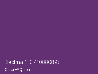 Decimal 1074088089 Color is a normal purple color and the nearest color is Imperial #602f6b. Hex code #633073 and RGB value is rgb(99,48,115). In RGB color space, this color is composed of 39% red, 19% green, 45% blue, In CMYK color space, this color is composed of 14% cyan, 58% magenta, 0% yellow , 55% black , In HSL color space, this color has a hue angle of 286° , 41% saturation and 32% lightness.