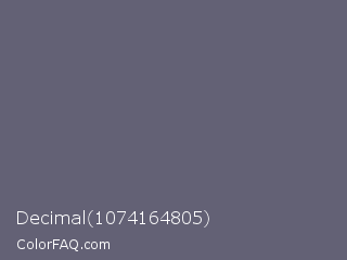 Decimal 1074164805 Color is a normal indigo color and the nearest color is Dolphin #646077. Hex code #636175 and RGB value is rgb(99,97,117). In RGB color space, this color is composed of 39% red, 38% green, 46% blue, In CMYK color space, this color is composed of 15% cyan, 17% magenta, 0% yellow , 54% black , In HSL color space, this color has a hue angle of 246° , 9% saturation and 42% lightness.