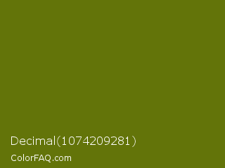 Decimal 1074209281 Color is a dark yellow color and the nearest color is Olivetone #716e10. Hex code #637409 and RGB value is rgb(99,116,9). In RGB color space, this color is composed of 39% red, 45% green, 4% blue, In CMYK color space, this color is composed of 15% cyan, 0% magenta, 92% yellow , 55% black , In HSL color space, this color has a hue angle of 70° , 86% saturation and 25% lightness.