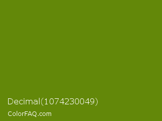 Decimal 1074230049 Color is a dark lime color and the nearest color is Avocado #568203. Hex code #638809 and RGB value is rgb(99,136,9). In RGB color space, this color is composed of 39% red, 53% green, 4% blue, In CMYK color space, this color is composed of 27% cyan, 0% magenta, 93% yellow , 47% black , In HSL color space, this color has a hue angle of 77° , 88% saturation and 28% lightness.
