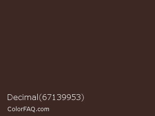 Decimal 67139953 Color is a very dark red color and the nearest color is English Walnut #3e2b23. Hex code #3d2823 and RGB value is rgb(61,40,35). In RGB color space, this color is composed of 24% red, 16% green, 14% blue, In CMYK color space, this color is composed of 0% cyan, 34% magenta, 43% yellow , 76% black , In HSL color space, this color has a hue angle of 12° , 27% saturation and 19% lightness.
