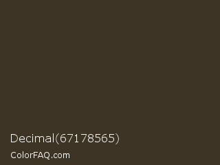 Decimal 67178565 Color is a very dark orange color and the nearest color is Olive Drab 7 #3c341f. Hex code #3d3425 and RGB value is rgb(61,52,37). In RGB color space, this color is composed of 24% red, 20% green, 15% blue, In CMYK color space, this color is composed of 0% cyan, 15% magenta, 39% yellow , 76% black , In HSL color space, this color has a hue angle of 38° , 24% saturation and 19% lightness.