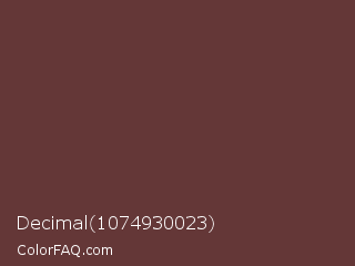 Decimal 1074930023 Color is a dark red color and the nearest color is Buccaneer #622f30. Hex code #643737 and RGB value is rgb(100,55,55). In RGB color space, this color is composed of 39% red, 22% green, 22% blue, In CMYK color space, this color is composed of 0% cyan, 45% magenta, 45% yellow , 61% black , In HSL color space, this color has a hue angle of 0° , 29% saturation and 30% lightness.
