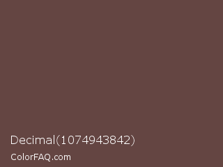 Decimal 1074943842 Color is a normal red color and the nearest color is Rose Ebony #674846. Hex code #644542 and RGB value is rgb(100,69,66). In RGB color space, this color is composed of 39% red, 27% green, 26% blue, In CMYK color space, this color is composed of 0% cyan, 31% magenta, 34% yellow , 61% black , In HSL color space, this color has a hue angle of 5° , 20% saturation and 33% lightness.