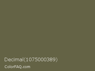 Decimal 1075000389 Color is a normal yellow color and the nearest color is Finch #626649. Hex code #646345 and RGB value is rgb(100,99,69). In RGB color space, this color is composed of 39% red, 39% green, 27% blue, In CMYK color space, this color is composed of 0% cyan, 1% magenta, 31% yellow , 61% black , In HSL color space, this color has a hue angle of 58° , 18% saturation and 33% lightness.