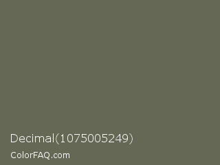 Decimal 1075005249 Color is a normal lime color and the nearest color is Siam #646a54. Hex code #646855 and RGB value is rgb(100,104,85). In RGB color space, this color is composed of 39% red, 41% green, 33% blue, In CMYK color space, this color is composed of 4% cyan, 0% magenta, 18% yellow , 59% black , In HSL color space, this color has a hue angle of 73° , 10% saturation and 37% lightness.