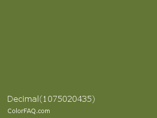 Decimal 1075020435 Color is a normal lime color and the nearest color is Crete #737829. Hex code #647635 and RGB value is rgb(100,118,53). In RGB color space, this color is composed of 39% red, 46% green, 21% blue, In CMYK color space, this color is composed of 15% cyan, 0% magenta, 55% yellow , 54% black , In HSL color space, this color has a hue angle of 77° , 38% saturation and 34% lightness.