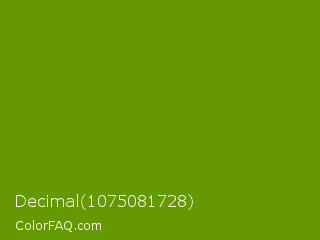 Decimal 1075081728 Color is a dark green color and the nearest color is Limeade #6f9d02. Hex code #649900 and RGB value is rgb(100,153,0). In RGB color space, this color is composed of 39% red, 60% green, 0% blue, In CMYK color space, this color is composed of 35% cyan, 0% magenta, 100% yellow , 40% black , In HSL color space, this color has a hue angle of 81° , 100% saturation and 30% lightness.