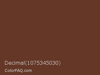 Decimal 1075345030 Color is a dark orange color and the nearest color is Irish Coffee #5f3d26. Hex code #653726 and RGB value is rgb(101,55,38). In RGB color space, this color is composed of 40% red, 22% green, 15% blue, In CMYK color space, this color is composed of 0% cyan, 46% magenta, 62% yellow , 60% black , In HSL color space, this color has a hue angle of 16° , 45% saturation and 27% lightness.
