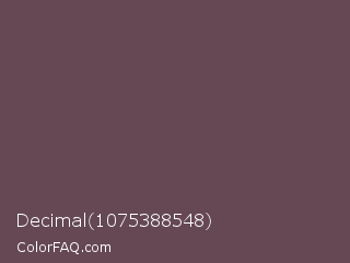 Decimal 1075388548 Color is a normal rose color and the nearest color is Deep Tuscan Red #66424d. Hex code #654854 and RGB value is rgb(101,72,84). In RGB color space, this color is composed of 40% red, 28% green, 33% blue, In CMYK color space, this color is composed of 0% cyan, 29% magenta, 17% yellow , 60% black , In HSL color space, this color has a hue angle of 335° , 17% saturation and 34% lightness.