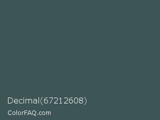 Decimal 67212608 Color is a dark cyan color and the nearest color is Mineral Green #3f5d53. Hex code #3d5554 and RGB value is rgb(61,85,84). In RGB color space, this color is composed of 24% red, 33% green, 33% blue, In CMYK color space, this color is composed of 28% cyan, 0% magenta, 1% yellow , 67% black , In HSL color space, this color has a hue angle of 178° , 16% saturation and 29% lightness.