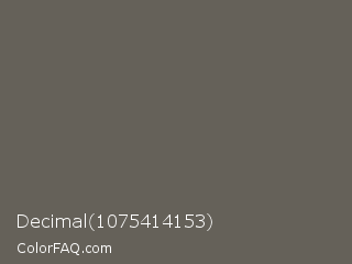 Decimal 1075414153 Color is a normal orange color and the nearest color is Soya Bean #6a6051. Hex code #656159 and RGB value is rgb(101,97,89). In RGB color space, this color is composed of 40% red, 38% green, 35% blue, In CMYK color space, this color is composed of 0% cyan, 4% magenta, 12% yellow , 60% black , In HSL color space, this color has a hue angle of 40° , 6% saturation and 37% lightness.