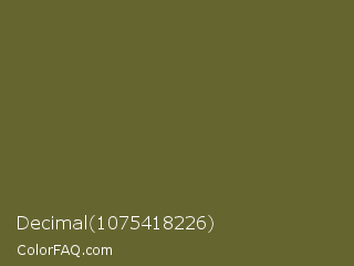 Decimal 1075418226 Color is a dark yellow color and the nearest color is Costa Del Sol #615d30. Hex code #656530 and RGB value is rgb(101,101,48). In RGB color space, this color is composed of 40% red, 40% green, 19% blue, In CMYK color space, this color is composed of 0% cyan, 0% magenta, 52% yellow , 60% black , In HSL color space, this color has a hue angle of 60° , 36% saturation and 29% lightness.