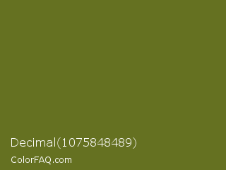 Decimal 1075848489 Color is a dark yellow color and the nearest color is Fern Frond #657220. Hex code #657121 and RGB value is rgb(101,113,33). In RGB color space, this color is composed of 40% red, 44% green, 13% blue, In CMYK color space, this color is composed of 11% cyan, 0% magenta, 71% yellow , 56% black , In HSL color space, this color has a hue angle of 69° , 55% saturation and 29% lightness.