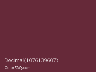 Decimal 1076139607 Color is a dark rose color and the nearest color is Buccaneer #622f30. Hex code #662939 and RGB value is rgb(102,41,57). In RGB color space, this color is composed of 40% red, 16% green, 22% blue, In CMYK color space, this color is composed of 0% cyan, 60% magenta, 44% yellow , 60% black , In HSL color space, this color has a hue angle of 344° , 43% saturation and 28% lightness.