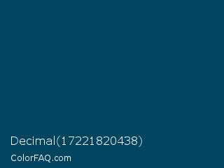Decimal 17221820438 Color is a very dark blue color and the nearest color is Astronaut Blue #013e62. Hex code #024560 and RGB value is rgb(2,69,96). In RGB color space, this color is composed of 1% red, 27% green, 38% blue, In CMYK color space, this color is composed of 98% cyan, 28% magenta, 0% yellow , 62% black , In HSL color space, this color has a hue angle of 197° , 96% saturation and 19% lightness.