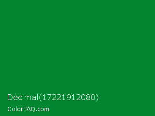 Decimal 17221912080 Color is a dark green color and the nearest color is North Texas Green #059033. Hex code #028632 and RGB value is rgb(2,134,50). In RGB color space, this color is composed of 1% red, 53% green, 20% blue, In CMYK color space, this color is composed of 99% cyan, 0% magenta, 63% yellow , 47% black , In HSL color space, this color has a hue angle of 142° , 97% saturation and 27% lightness.