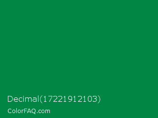 Decimal 17221912103 Color is a dark green color and the nearest color is Salem #097f4b. Hex code #028643 and RGB value is rgb(2,134,67). In RGB color space, this color is composed of 1% red, 53% green, 26% blue, In CMYK color space, this color is composed of 99% cyan, 0% magenta, 50% yellow , 47% black , In HSL color space, this color has a hue angle of 150° , 97% saturation and 27% lightness.
