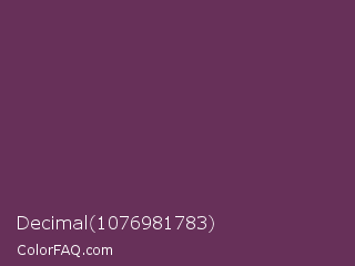 Decimal 1076981783 Color is a dark magenta color and the nearest color is Finn #692d54. Hex code #673059 and RGB value is rgb(103,48,89). In RGB color space, this color is composed of 40% red, 19% green, 35% blue, In CMYK color space, this color is composed of 0% cyan, 53% magenta, 14% yellow , 60% black , In HSL color space, this color has a hue angle of 315° , 36% saturation and 30% lightness.