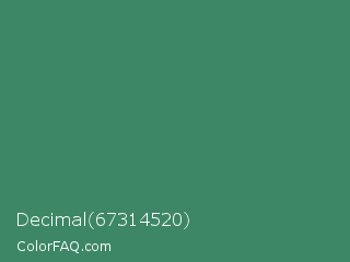 Decimal 67314520 Color is a normal green color and the nearest color is Viridian #40826d. Hex code #3d8766 and RGB value is rgb(61,135,102). In RGB color space, this color is composed of 24% red, 53% green, 40% blue, In CMYK color space, this color is composed of 55% cyan, 0% magenta, 24% yellow , 47% black , In HSL color space, this color has a hue angle of 153° , 38% saturation and 38% lightness.