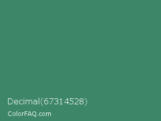 Decimal 67314528 Color is a normal green color and the nearest color is Viridian #40826d. Hex code #3d8768 and RGB value is rgb(61,135,104). In RGB color space, this color is composed of 24% red, 53% green, 41% blue, In CMYK color space, this color is composed of 55% cyan, 0% magenta, 23% yellow , 47% black , In HSL color space, this color has a hue angle of 155° , 38% saturation and 38% lightness.