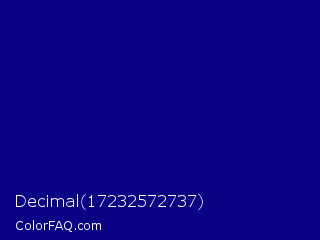 Decimal 17232572737 Color is a dark indigo color and the nearest color is Navy Blue #000080. Hex code #090085 and RGB value is rgb(9,0,133). In RGB color space, this color is composed of 4% red, 0% green, 52% blue, In CMYK color space, this color is composed of 93% cyan, 100% magenta, 0% yellow , 48% black , In HSL color space, this color has a hue angle of 244° , 100% saturation and 26% lightness.