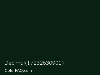 Decimal 17232630901 Color is a almost black green color and the nearest color is Palm Green #09230f. Hex code #092113 and RGB value is rgb(9,33,19). In RGB color space, this color is composed of 4% red, 13% green, 7% blue, In CMYK color space, this color is composed of 73% cyan, 0% magenta, 42% yellow , 87% black , In HSL color space, this color has a hue angle of 145° , 57% saturation and 8% lightness.