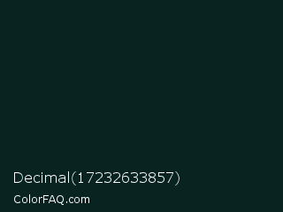 Decimal 17232633857 Color is a almost black cyan color and the nearest color is Aztec #0d1c19. Hex code #092321 and RGB value is rgb(9,35,33). In RGB color space, this color is composed of 4% red, 14% green, 13% blue, In CMYK color space, this color is composed of 74% cyan, 0% magenta, 6% yellow , 86% black , In HSL color space, this color has a hue angle of 175° , 59% saturation and 9% lightness.