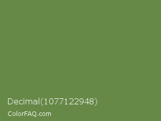 Decimal 1077122948 Color is a normal green color and the nearest color is Palm Leaf #6f9940. Hex code #678948 and RGB value is rgb(103,137,72). In RGB color space, this color is composed of 40% red, 54% green, 28% blue, In CMYK color space, this color is composed of 25% cyan, 0% magenta, 47% yellow , 46% black , In HSL color space, this color has a hue angle of 91° , 31% saturation and 41% lightness.