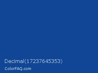 Decimal 17237645353 Color is a normal blue color and the nearest color is Yale Blue #0f4d92. Hex code #104695 and RGB value is rgb(16,70,149). In RGB color space, this color is composed of 6% red, 27% green, 58% blue, In CMYK color space, this color is composed of 89% cyan, 53% magenta, 0% yellow , 42% black , In HSL color space, this color has a hue angle of 216° , 81% saturation and 32% lightness.