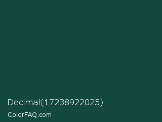 Decimal 17238922025 Color is a very dark cyan color and the nearest color is MSU Green #18453b. Hex code #124841 and RGB value is rgb(18,72,65). In RGB color space, this color is composed of 7% red, 28% green, 25% blue, In CMYK color space, this color is composed of 75% cyan, 0% magenta, 10% yellow , 72% black , In HSL color space, this color has a hue angle of 172° , 60% saturation and 18% lightness.