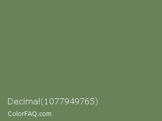 Decimal 1077949765 Color is a normal green color and the nearest color is Glade Green #61845f. Hex code #688259 and RGB value is rgb(104,130,89). In RGB color space, this color is composed of 41% red, 51% green, 35% blue, In CMYK color space, this color is composed of 20% cyan, 0% magenta, 32% yellow , 49% black , In HSL color space, this color has a hue angle of 98° , 19% saturation and 43% lightness.