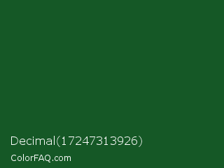 Decimal 17247313926 Color is a very dark green color and the nearest color is Cal Poly Pomona Green #1e4d2b. Hex code #155826 and RGB value is rgb(21,88,38). In RGB color space, this color is composed of 8% red, 35% green, 15% blue, In CMYK color space, this color is composed of 76% cyan, 0% magenta, 57% yellow , 65% black , In HSL color space, this color has a hue angle of 135° , 61% saturation and 21% lightness.
