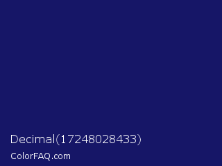 Decimal 17248028433 Color is a dark blue color and the nearest color is Lucky Point #1a1a68. Hex code #161667 and RGB value is rgb(22,22,103). In RGB color space, this color is composed of 9% red, 9% green, 40% blue, In CMYK color space, this color is composed of 79% cyan, 79% magenta, 0% yellow , 60% black , In HSL color space, this color has a hue angle of 240° , 65% saturation and 25% lightness.