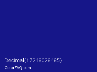 Decimal 17248028485 Color is a normal blue color and the nearest color is Ultramarine #120a8f. Hex code #161689 and RGB value is rgb(22,22,137). In RGB color space, this color is composed of 9% red, 9% green, 54% blue, In CMYK color space, this color is composed of 84% cyan, 84% magenta, 0% yellow , 46% black , In HSL color space, this color has a hue angle of 240° , 72% saturation and 31% lightness.
