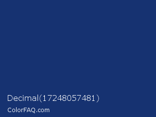 Decimal 17248057481 Color is a dark blue color and the nearest color is Biscay #1b3162. Hex code #163271 and RGB value is rgb(22,50,113). In RGB color space, this color is composed of 9% red, 20% green, 44% blue, In CMYK color space, this color is composed of 81% cyan, 56% magenta, 0% yellow , 56% black , In HSL color space, this color has a hue angle of 222° , 67% saturation and 26% lightness.