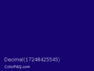 Decimal 17248425545 Color is a dark indigo color and the nearest color is Arapawa #110c6c. Hex code #170471 and RGB value is rgb(23,4,113). In RGB color space, this color is composed of 9% red, 2% green, 44% blue, In CMYK color space, this color is composed of 80% cyan, 96% magenta, 0% yellow , 56% black , In HSL color space, this color has a hue angle of 250° , 93% saturation and 23% lightness.